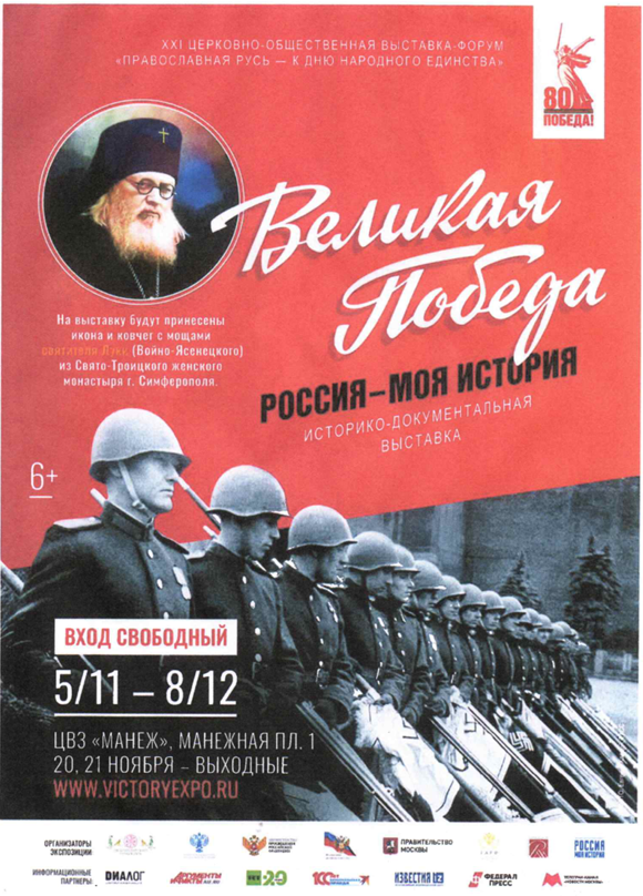 С 5 ноября по 8 декабря 2025 года в ЦВЗ «Манеж» в рамках XXI Церковно общественной выставки-форума «Православная Русь - к Дню народного единства» Патриарший совет по культуре Русской Православной Церкви совместно с Федеральным архивным агентством, Государственным архивом Российской Федерации реализует историко-документальный выставочный проект «Великая Победа. Россия - моя история», завершающий год празднования 80-летия Победы в Великой Отечественной войне.