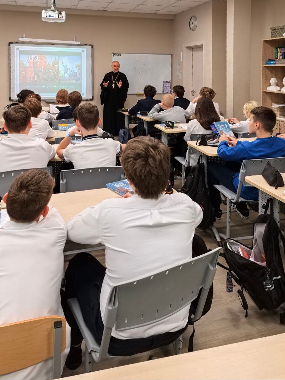 7 ноября 2025 г. в СОШ №2 в Опалихе, в 7 классе прошел открытый урок по истории России. Педагоги пригласили на занятие клирика Успенского храма г. Красногорска священника Романа Жесткова.
