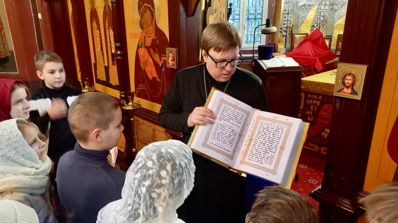 Экскурсию для них провёл священник Андрей Плотников. Отец Андрей рассказал об устройстве храма и иконах. Больше всего детям понравилось, когда батюшка показал им богослужебное Евангелие, кадило, священническое облачение и другую церковную утварь. Дети смогли близко рассмотреть предметы, находящиеся в алтаре; некоторые даже попробовали почитать Евангелие на церковнославянском языке.